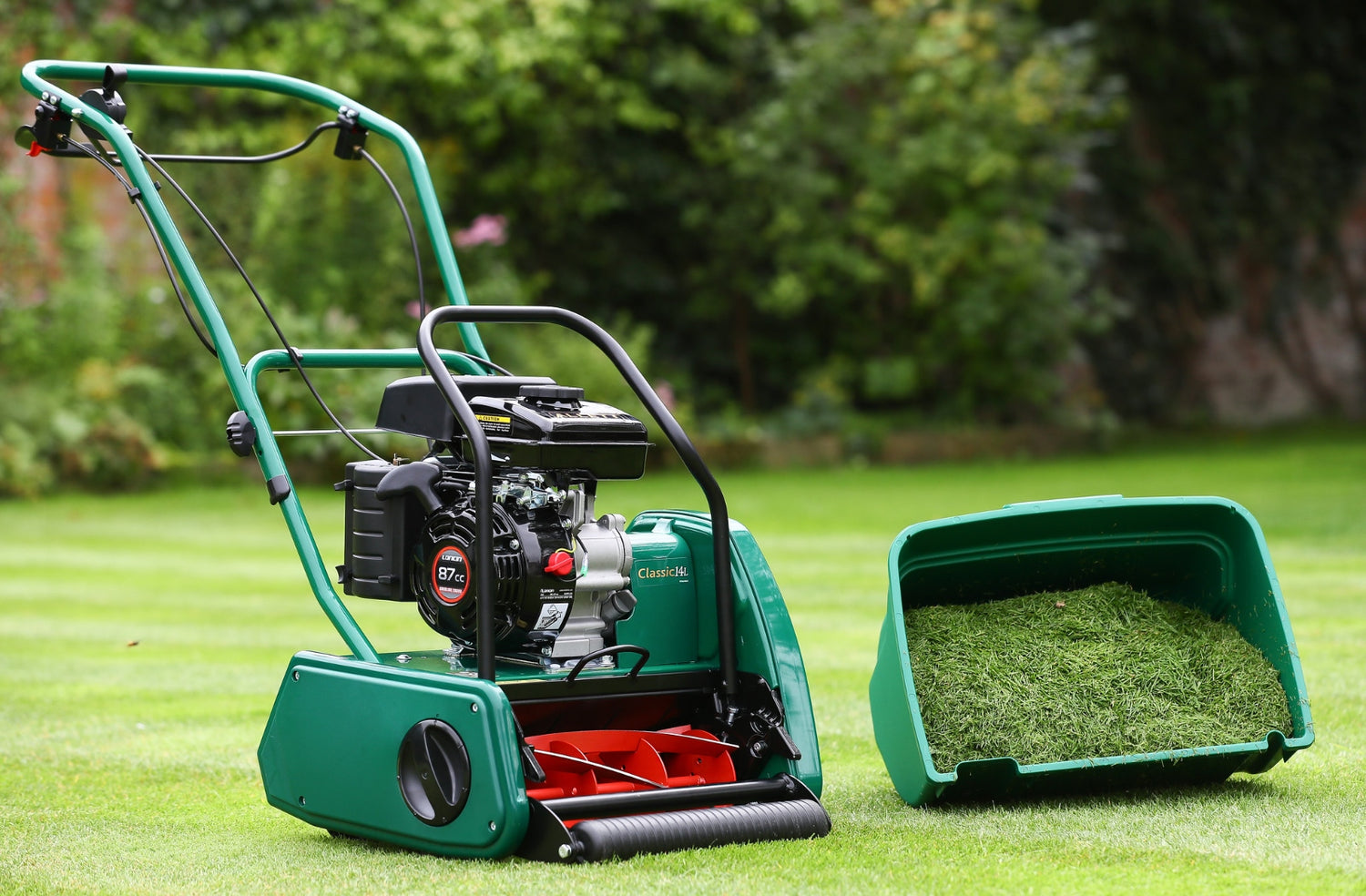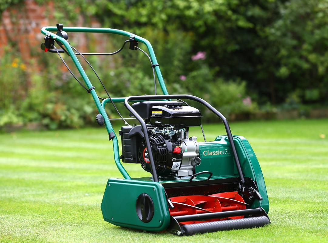 The Allett entry-level petrol engine powered models are self-propelled with a 5-bladed cylinder available in either 14" (356mm) or 17" (430mm) width of cut for lawns up-to 280 square metres. These mowers produce stripes on small-medium lawns where budget is important.