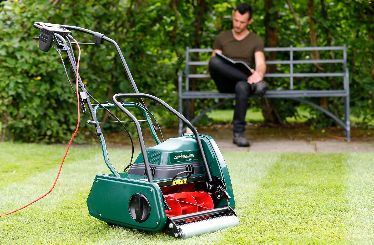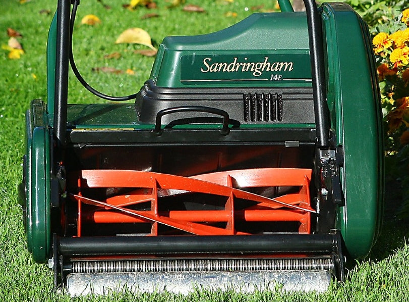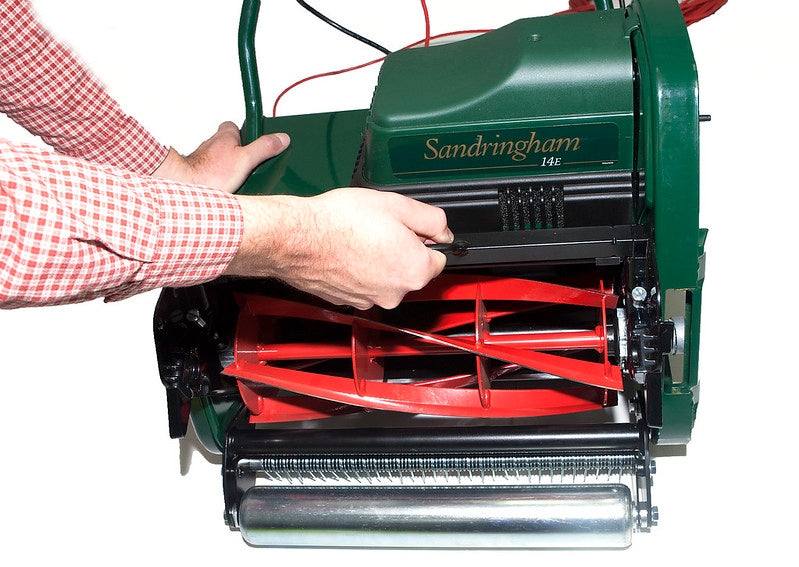 The Sandringham 14E is the premium mains-electric cylinder mower from Allett. The 240V, 420 Watt motor powers both the cutting cylinder and the rear roller giving reduced effort from a controllable self-propelled drive system.