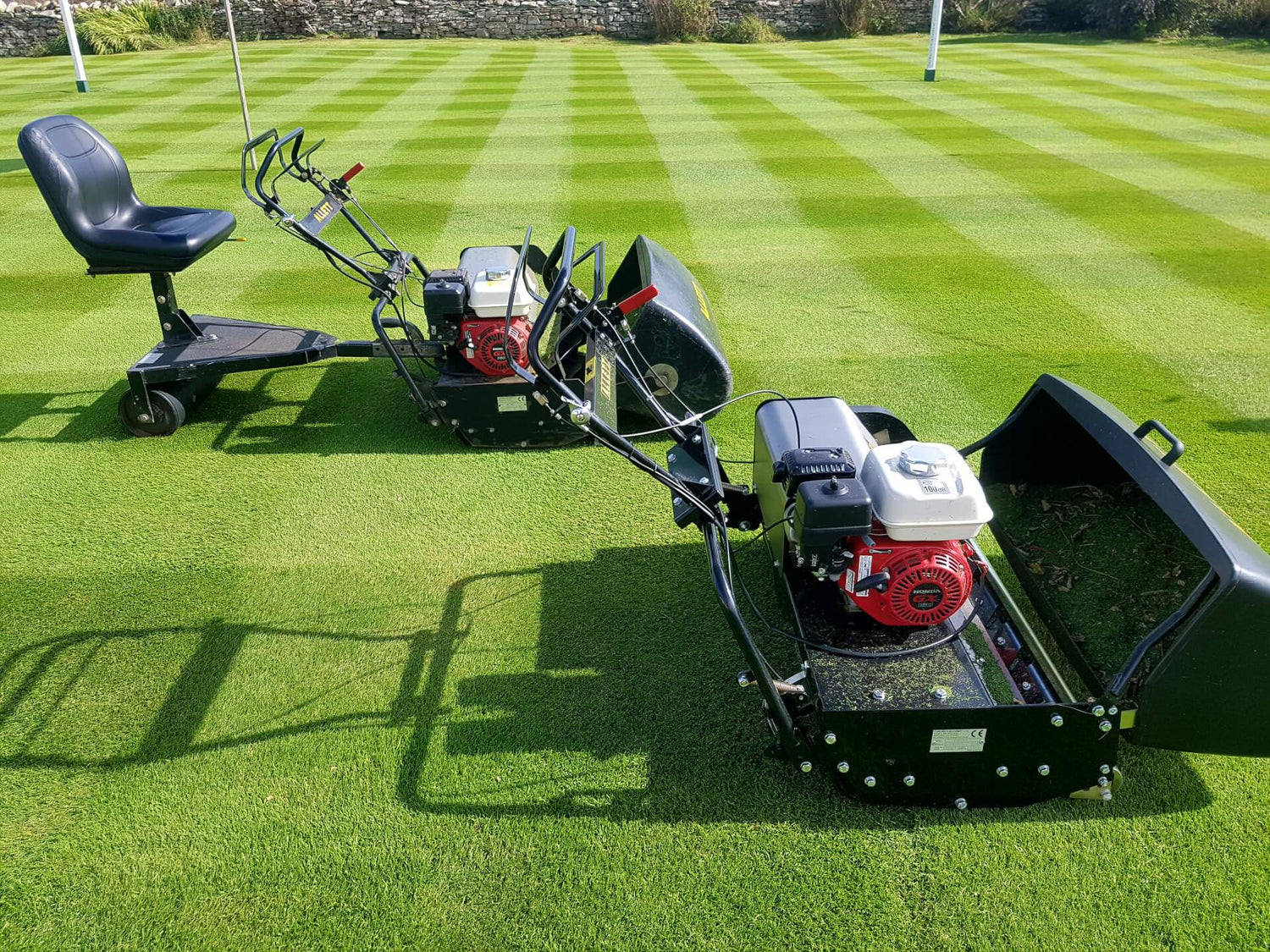 Wheel kit comprising two wheels and two anti-scalp rollers fitted in place of the rear roller and front roller respectively. The result is a rear-discharge cylinder mower capable of working in a wide range of grass lengths and conditions. Speed reduction kit. Optional trailing seat (Buffalo 34 only). Each mower’s cutting cylinder has a 200mm (8in) diameter with 8 blades, and an adjustable cutting height from 10mm-40mm.