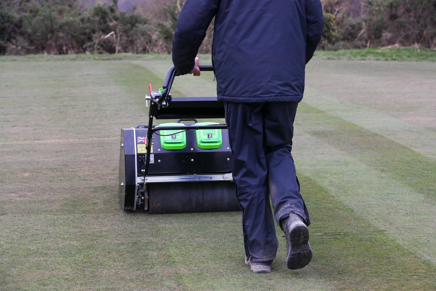 The system has the power to run a series of interchangeable cartridges to scarify, rake, aerate, brush and verti-cut as well as mow with strong striping and an impeccable cut. Quiet operation, no petrol requirement, less than one hour to recharge batteries and much reduced HAV’s (Hand Arm Vibration) add up to a more environmentally sensitive product with no emissions. These are all benefits which will be particularly recognised in enclosed stadiums. The 82V (6Ah) system is powerful enough to deliver the performance required, even for such a large mower, and drive the cartridges for year-round professional multiple task turf maintenance.