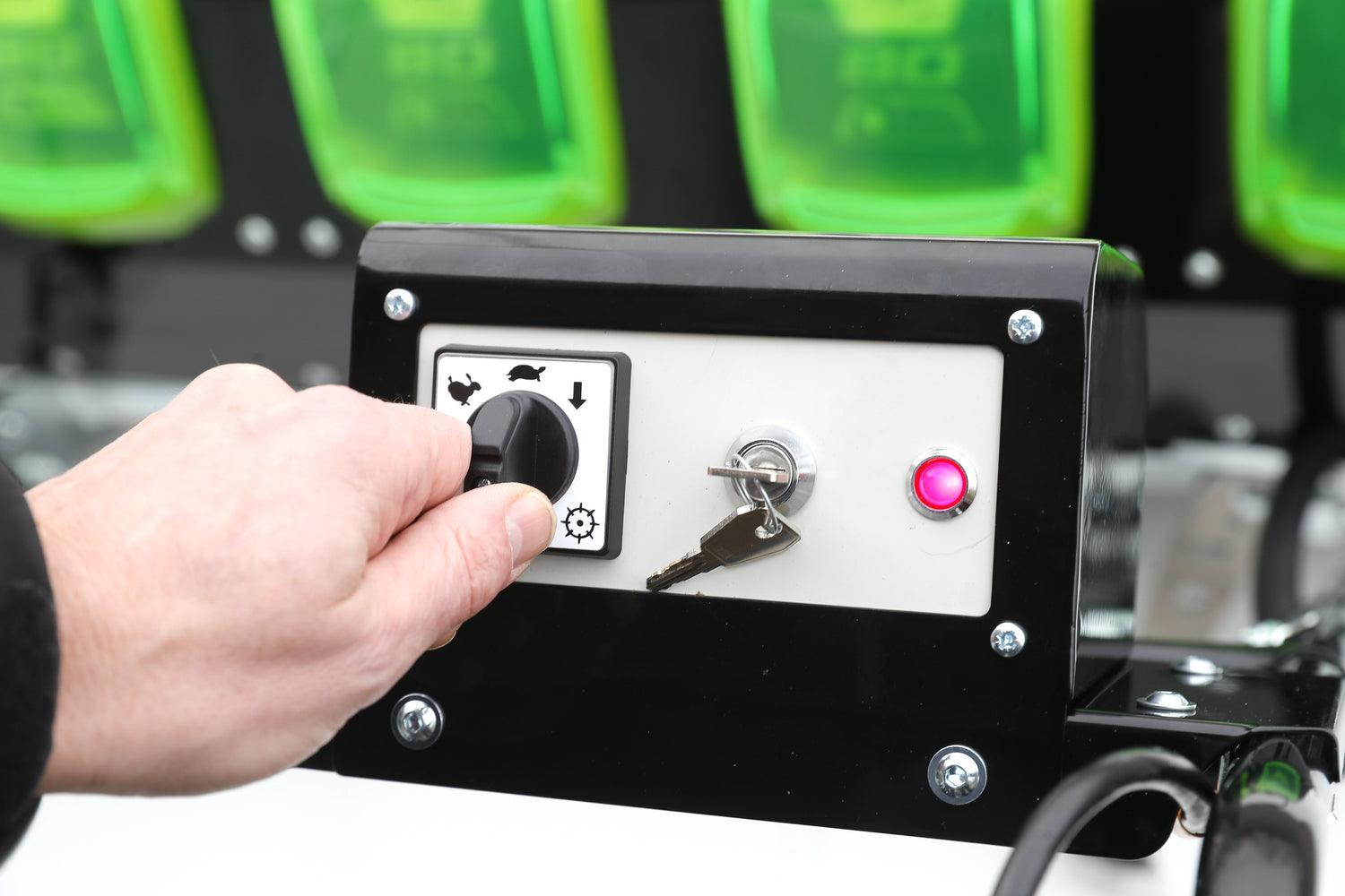 - Cartridge head engagement 2 action safety switch & bale bar for cylinder/cartridge engagement, cylinder mode switch* gives option modes for the cartridge fitted, i.e. gives cylinder speed options and reverse drive for the most effective scarifying operation