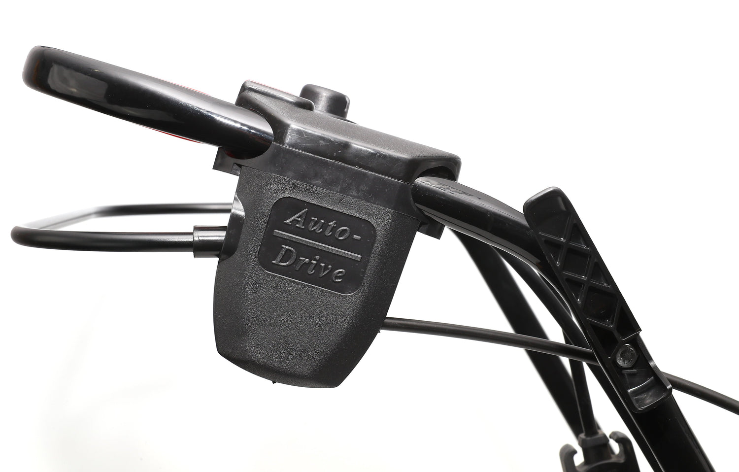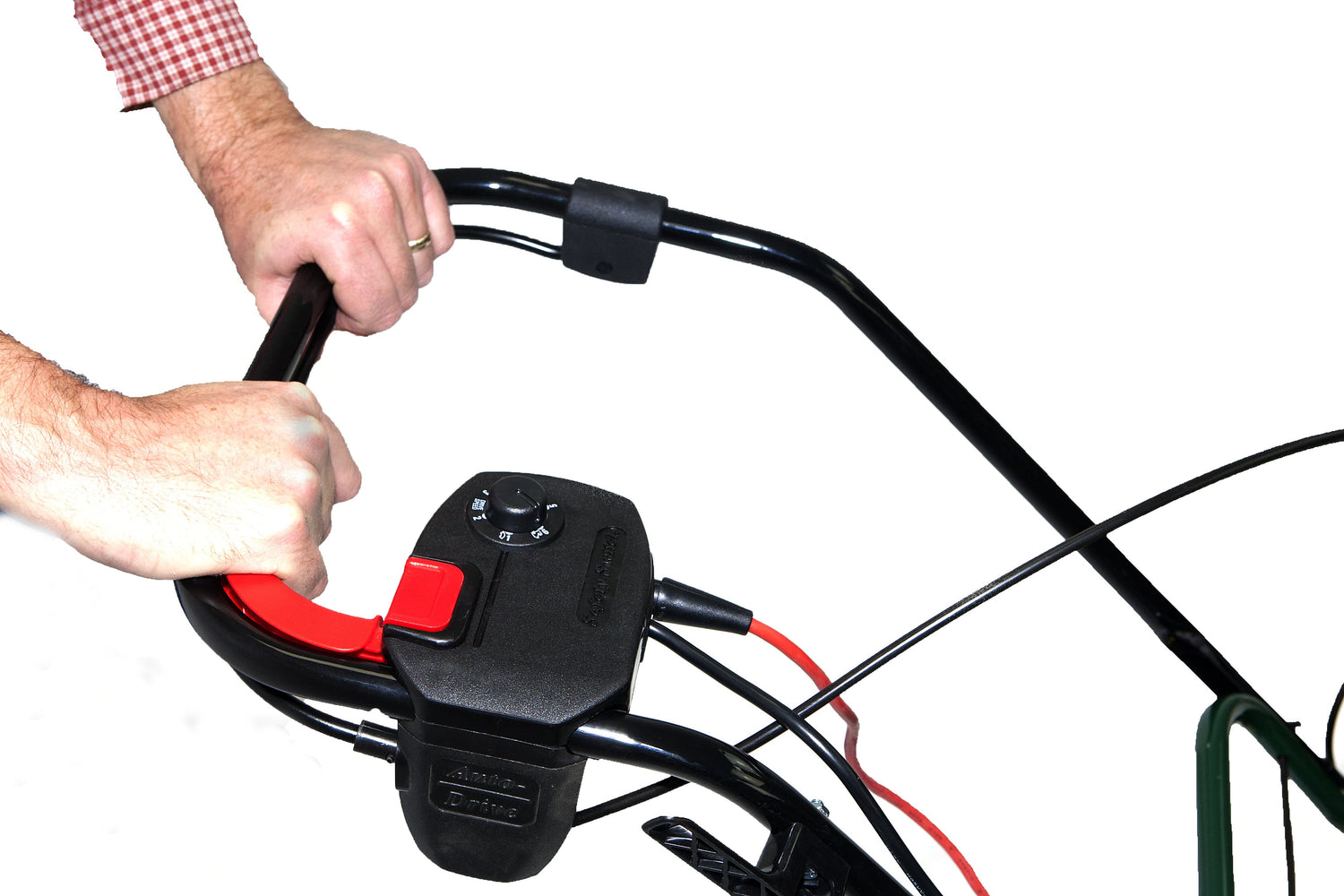 Handlebars have two height positions to enable ease of use, and it’s also able to be folded. The 32-litre large grassbox is made from sturdy polypropylene. The machine is a total of 52cm (20.5″) in width and weighs a total of 28kg with the grassbox.
