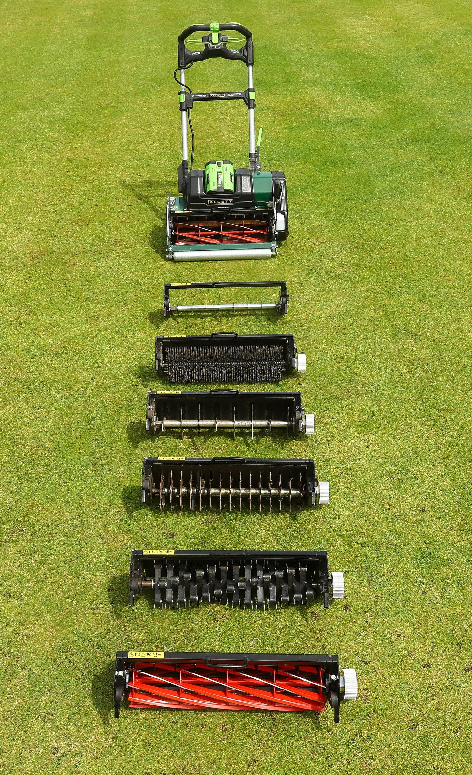 The 6-bladed mowing cartridge comes as standard. There is an optional 10-bladed cylinder with a thinner front-edged blade for where a close shave is desired for example golf and bowling greens.