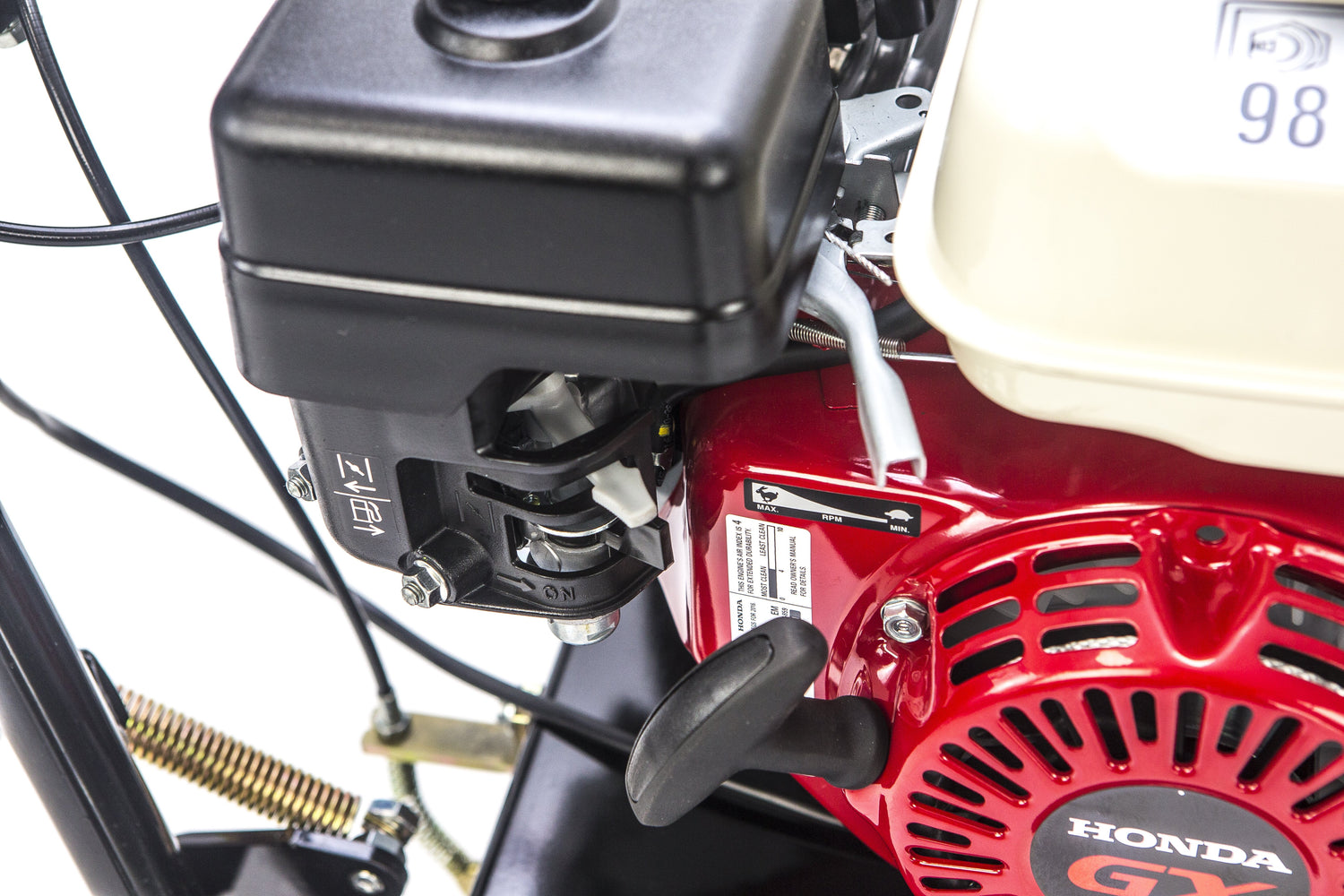 - Drive engagement Handle-mounted lever engaging V belt drive via cable